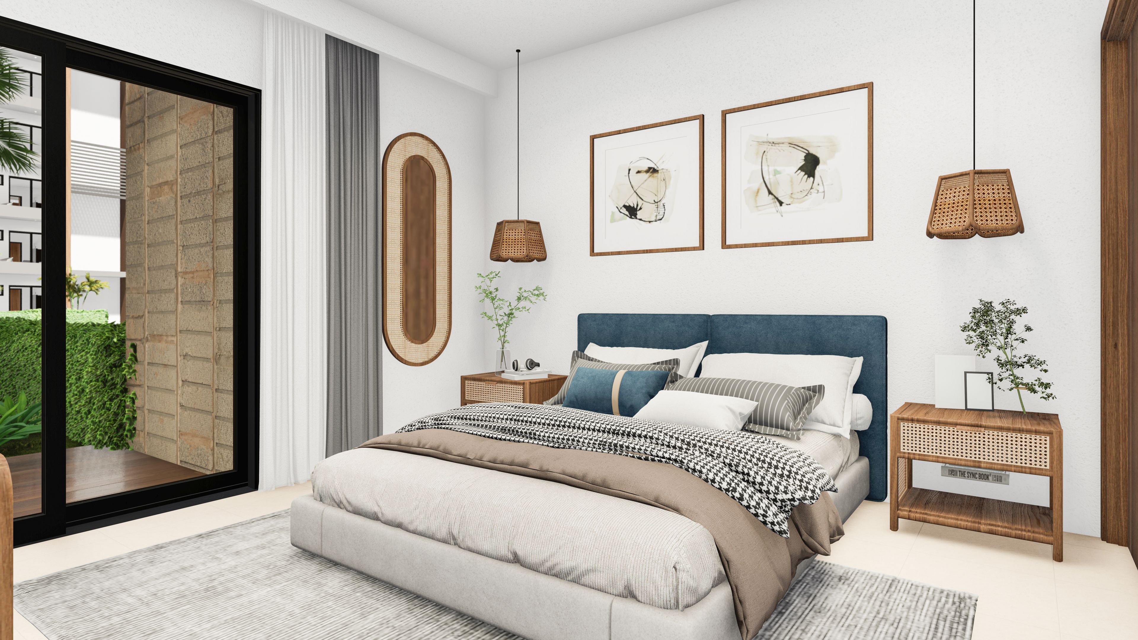 The master suite is more than just a bedroom, it’s a luxurious retreat designed for rest, relaxation, and renewal. This spacious room is bathed in natural light, with large windows that provide a panoramic view of the gardens or the community landscape. Thanks to the condominiums smart orientation, you’ll enjoy a cool breeze and excellent airflow.